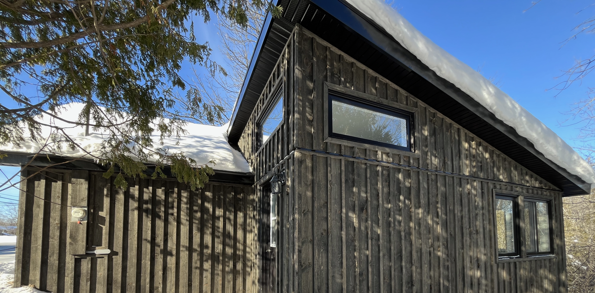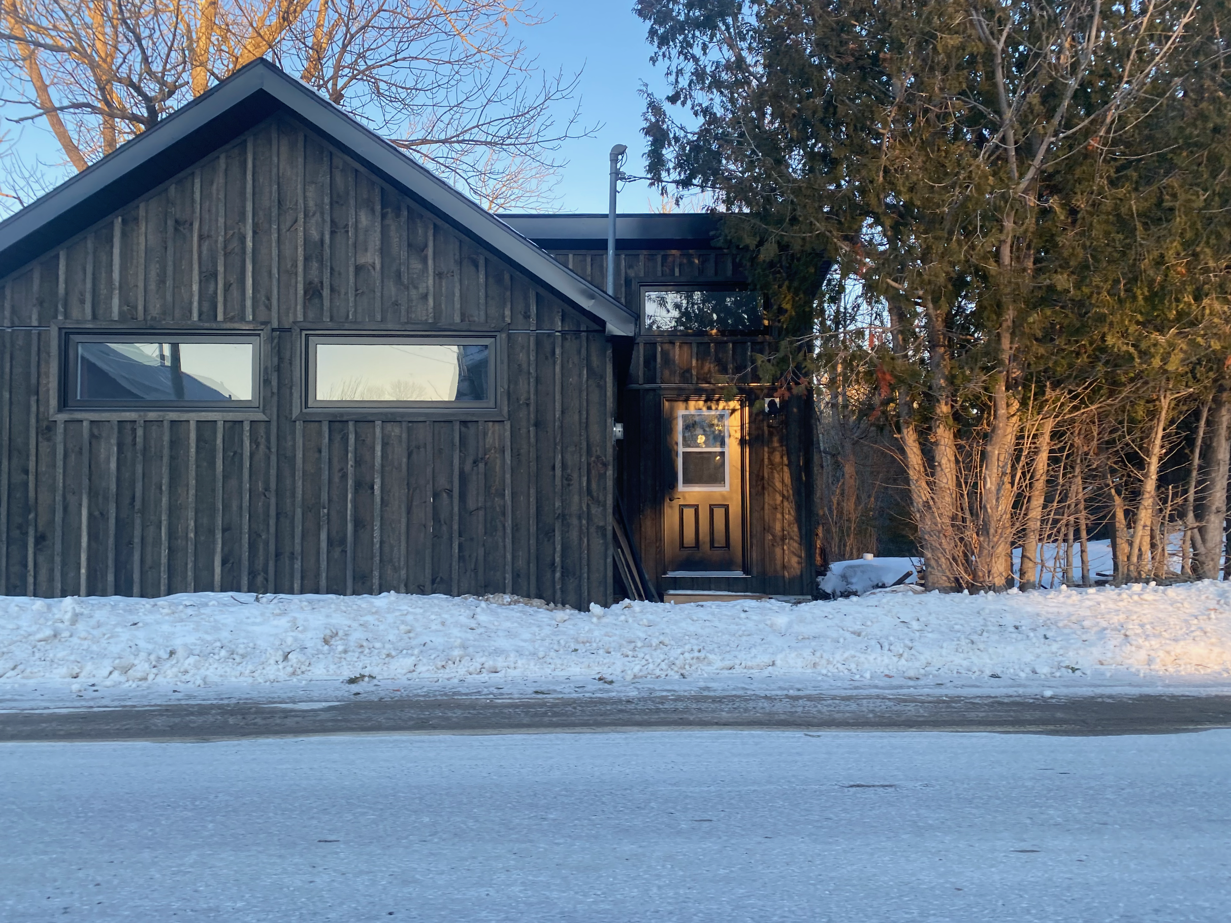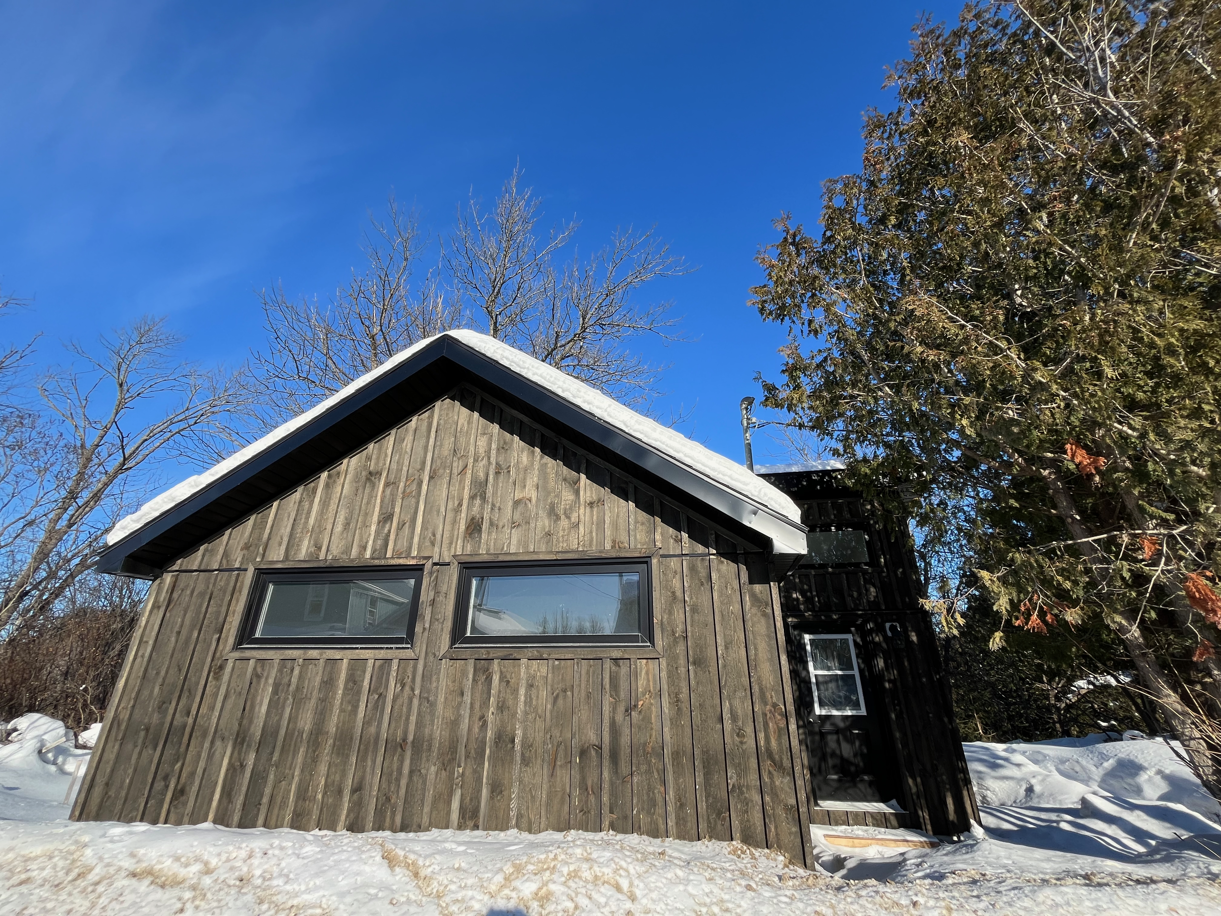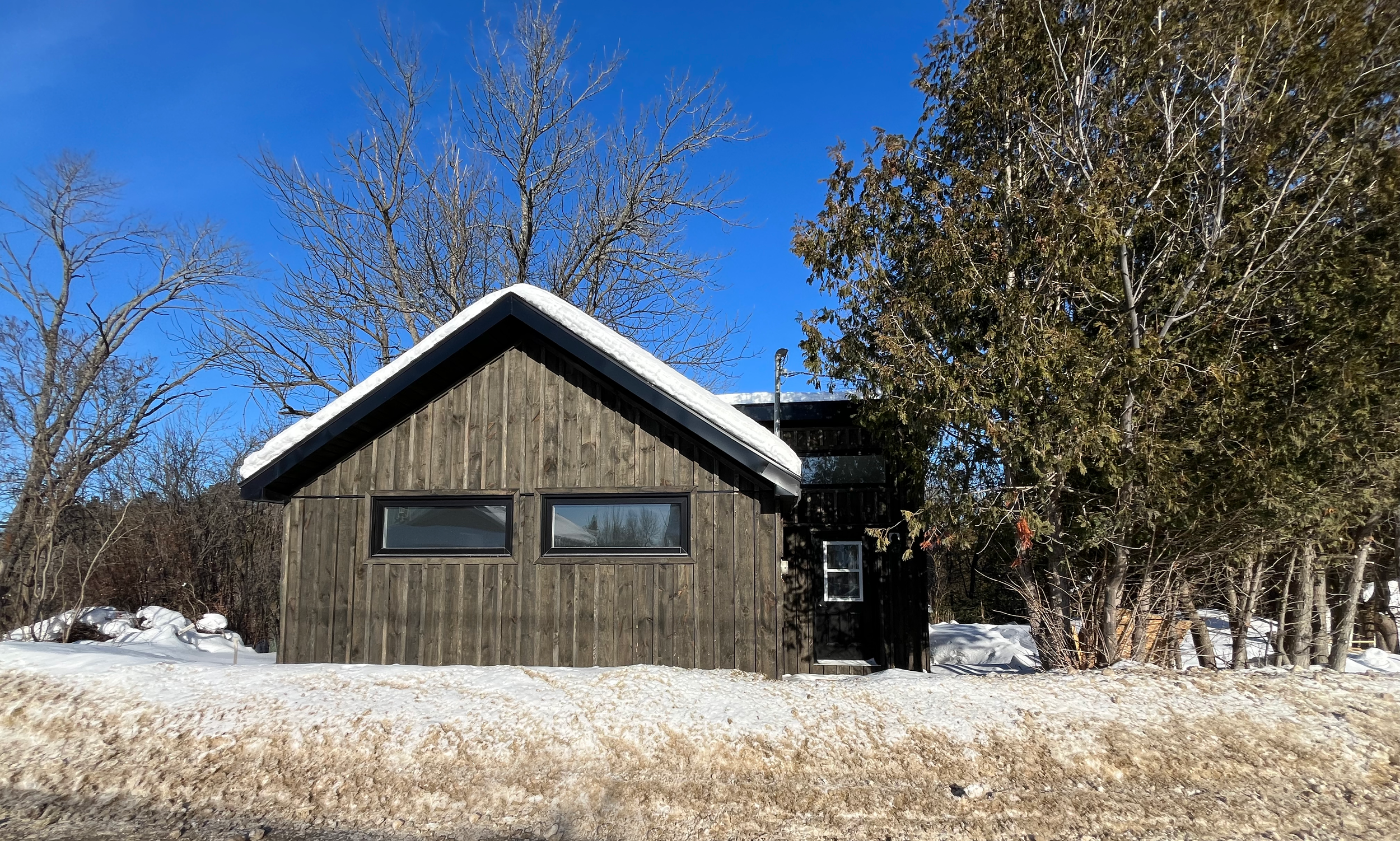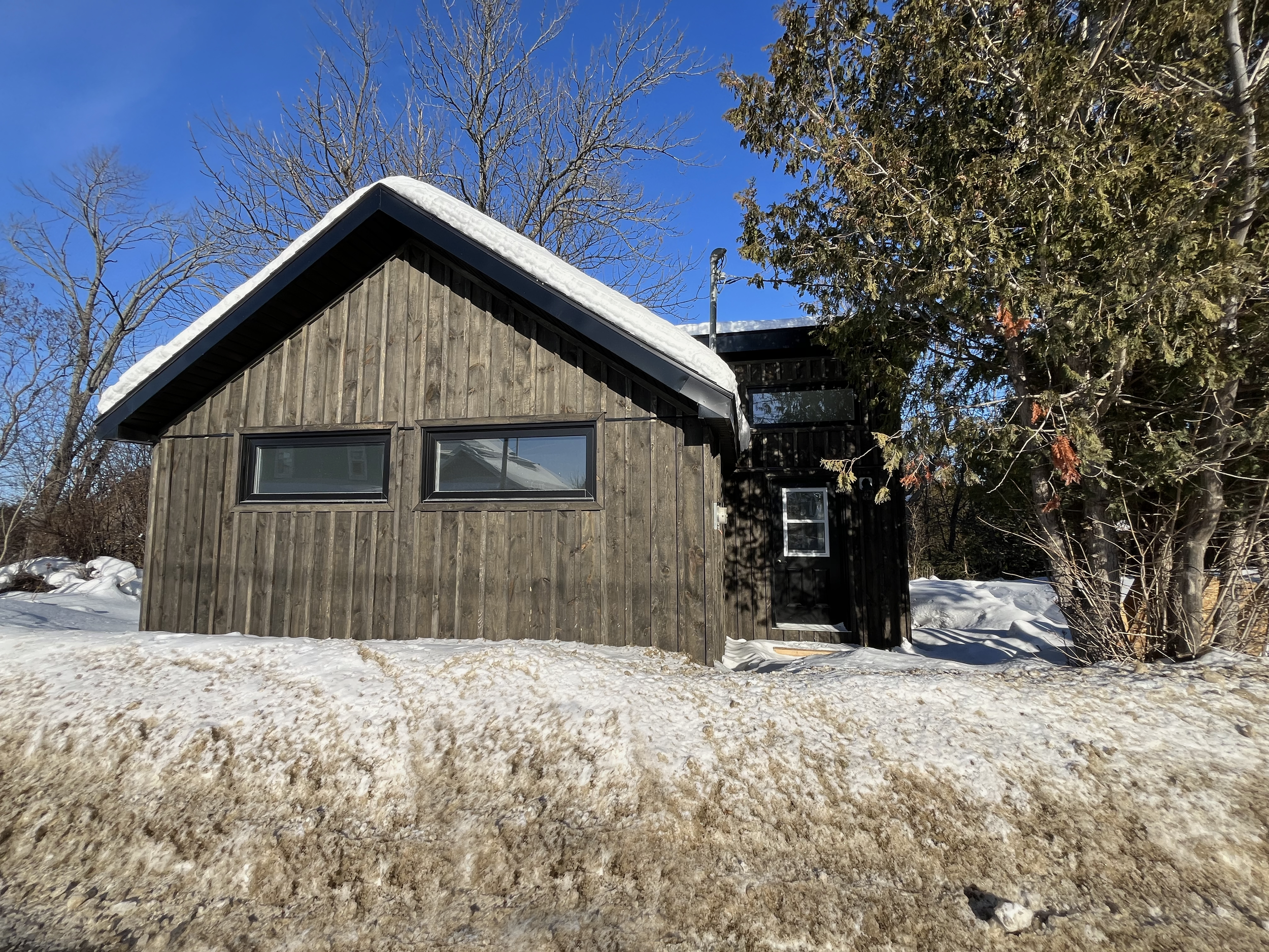 Inside you’ll find one bedroom plus additional loft space, and one bathroom with a shower. The heat pump system ready to be installed will keep the space warm in winter, and cool in the summer. There are high windows in the front living space, for privacy and soundproofing. The large back room features an entire wall of windows overlooking the Kagawong River Ravine, just down river from Bridal Veil Falls.