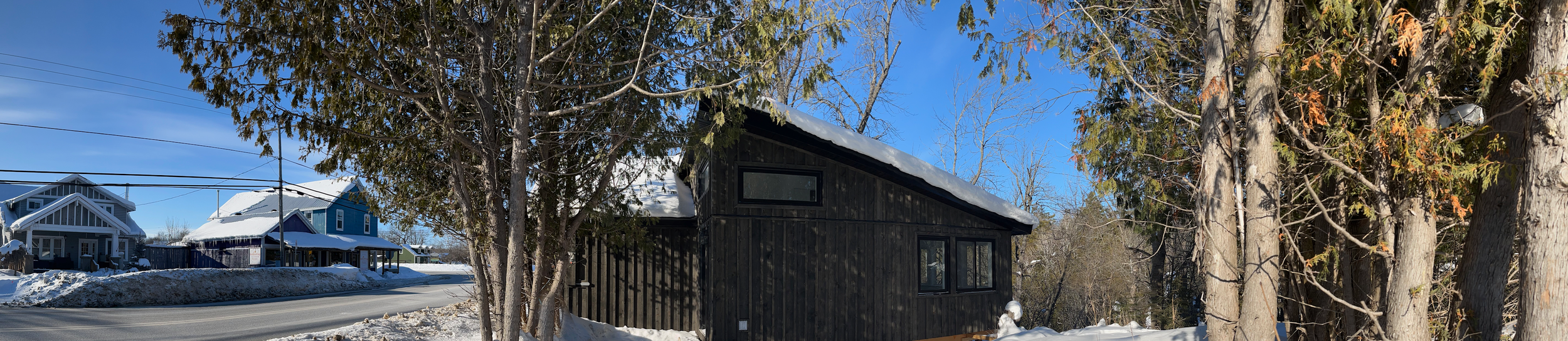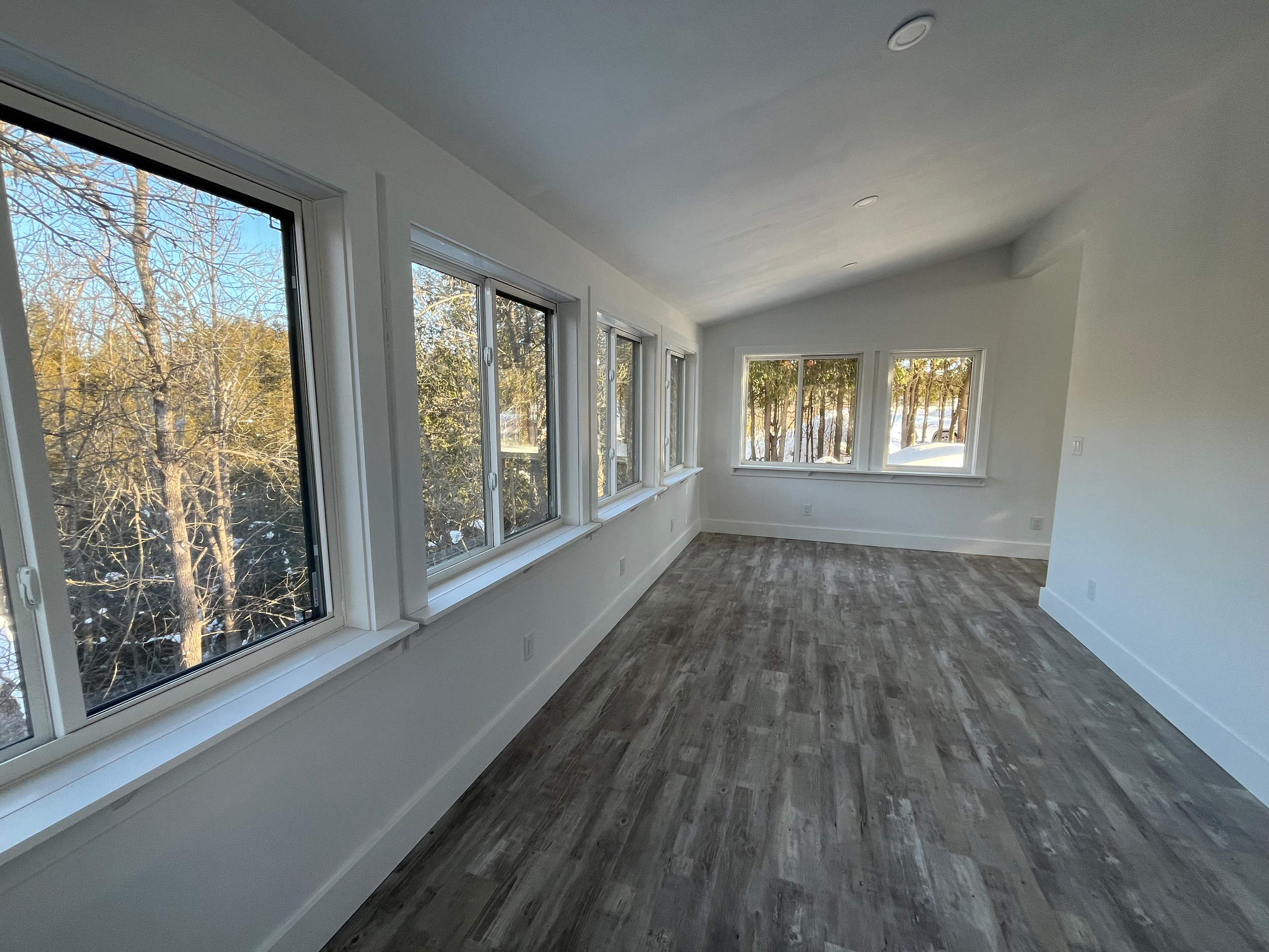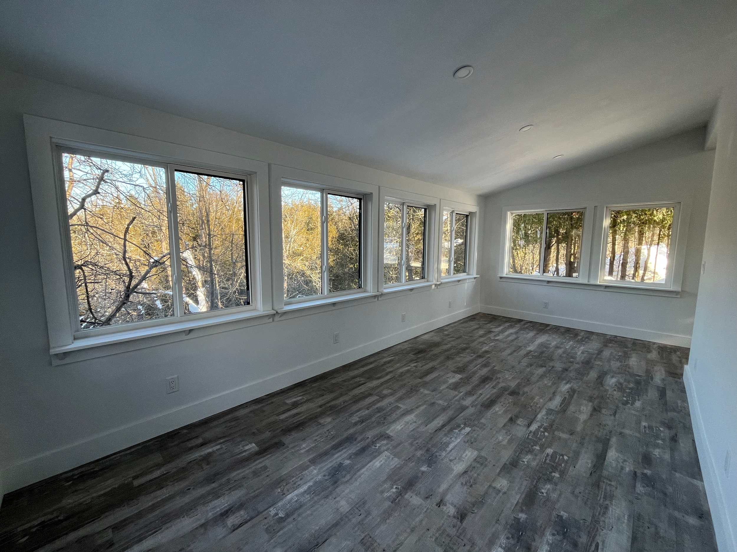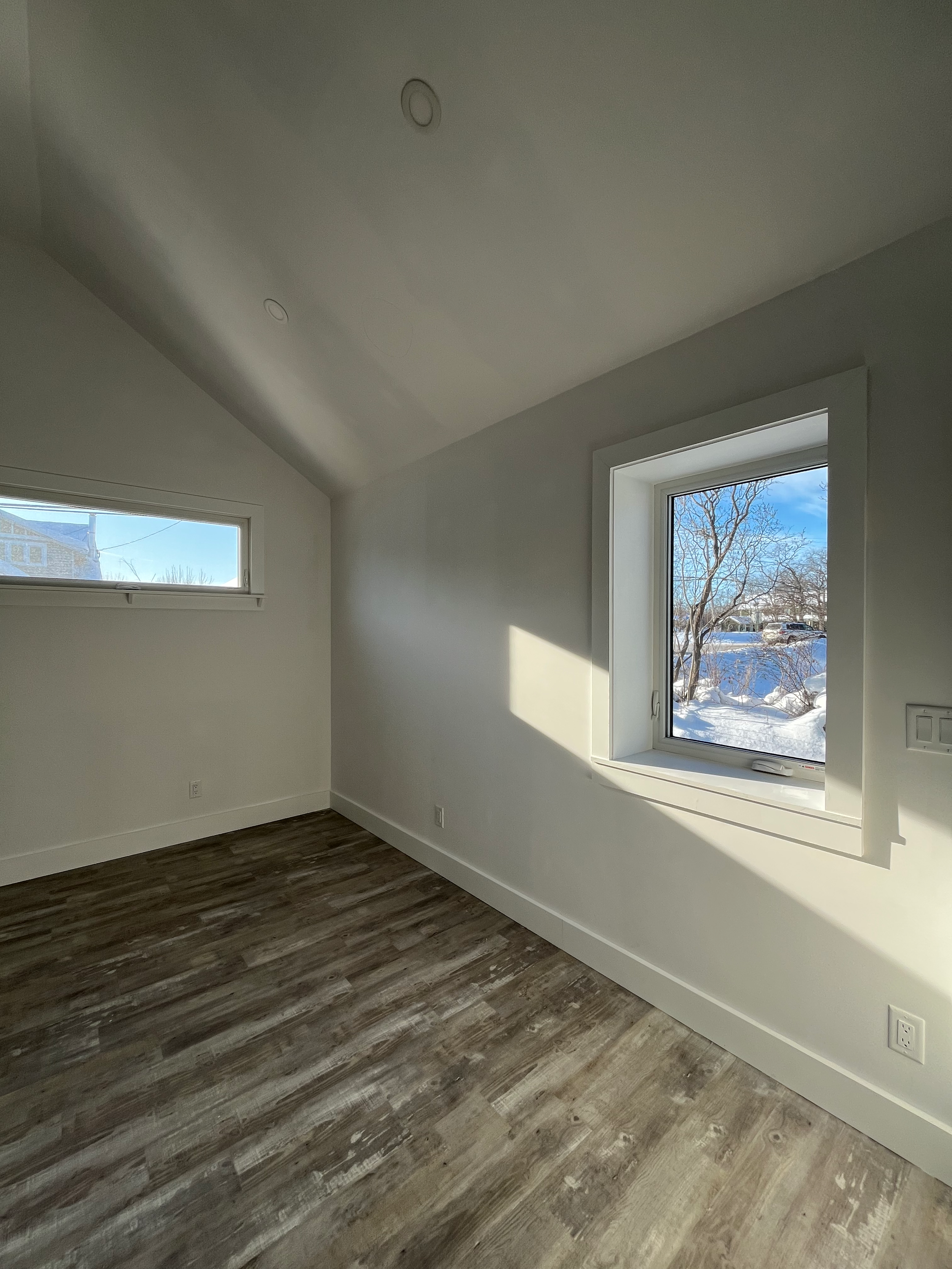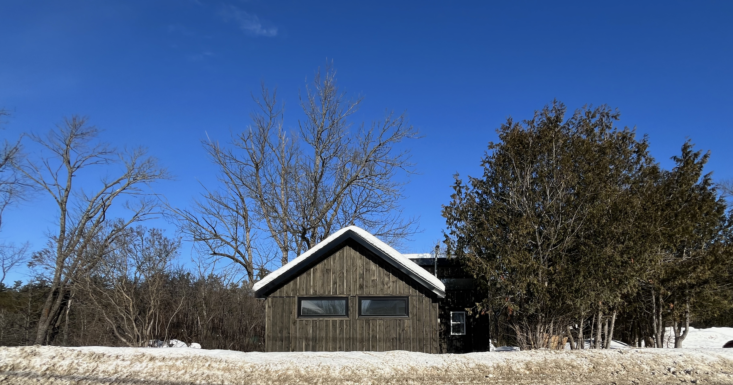 Inside you’ll find one bedroom plus additional loft space, and one bathroom with a shower. The heat pump system ready to be installed will keep the space warm in winter, and cool in the summer. There are high windows in the front living space, for privacy and soundproofing. The large back room features an entire wall of windows overlooking the Kagawong River Ravine, just down river from Bridal Veil Falls.