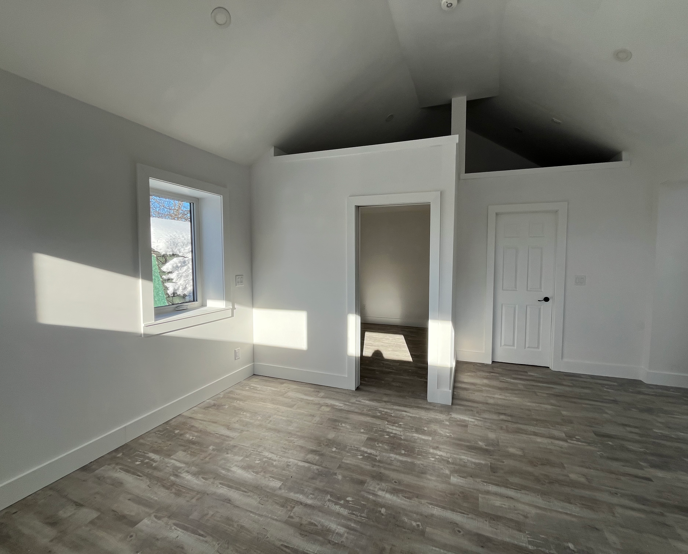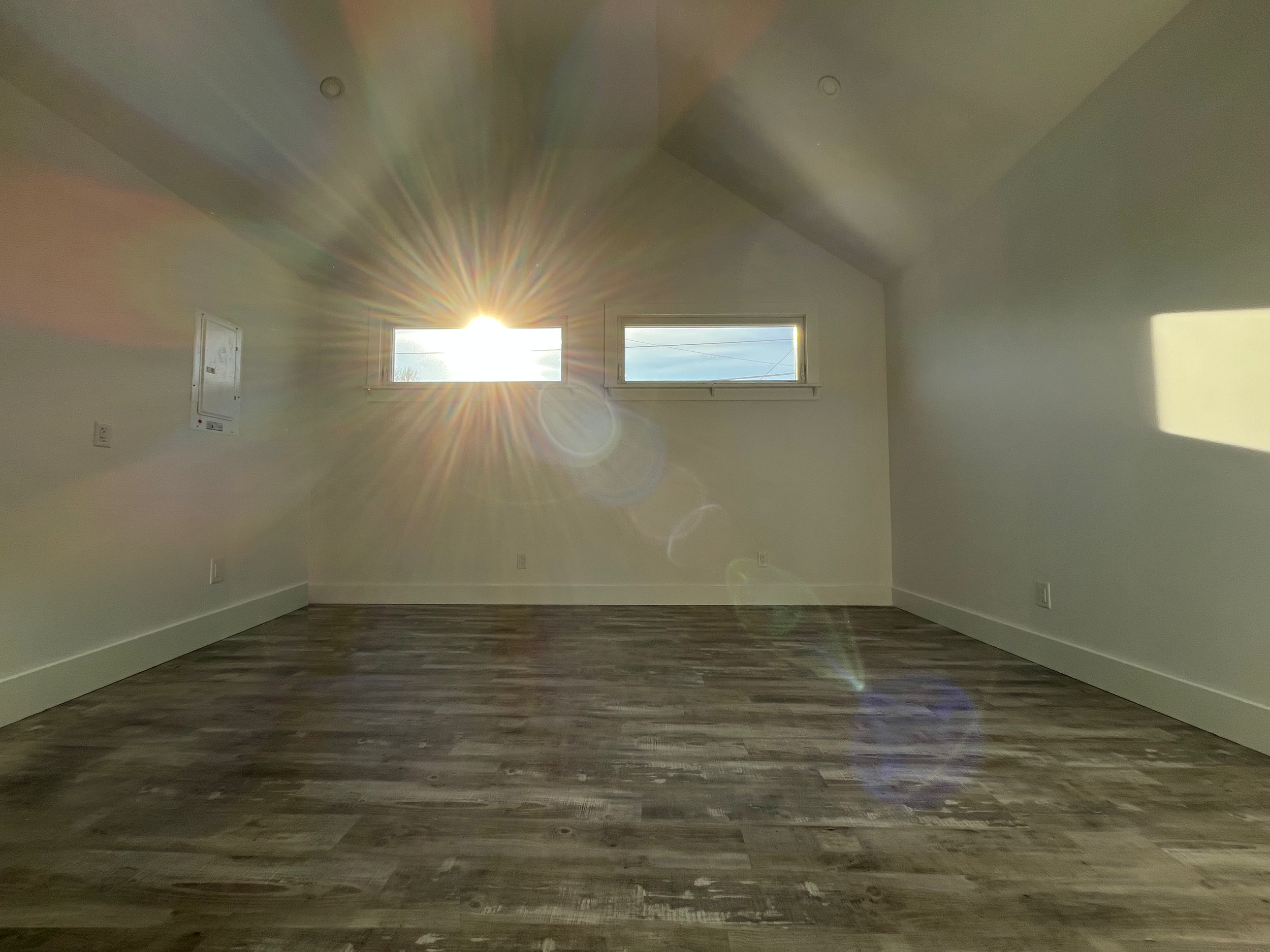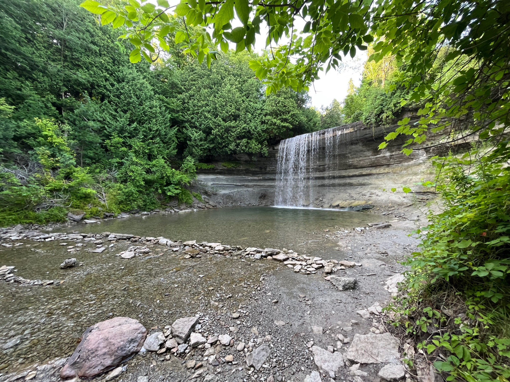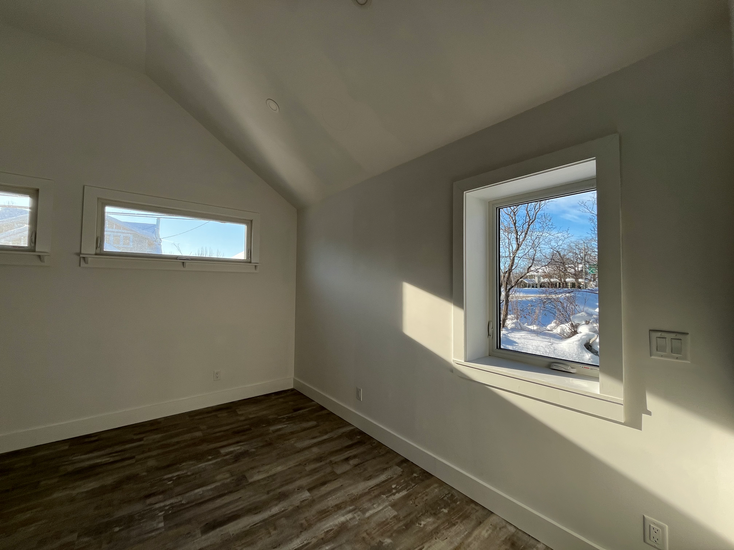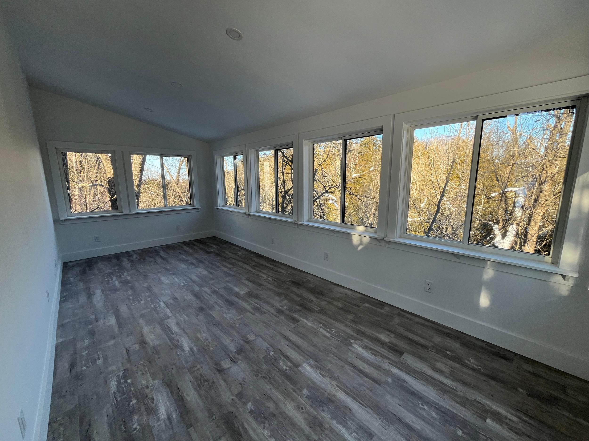 Inside you’ll find one bedroom plus additional loft space, and one bathroom with a shower. The heat pump system ready to be installed will keep the space warm in winter, and cool in the summer. There are high windows in the front living space, for privacy and soundproofing. The large back room features an entire wall of windows overlooking the Kagawong River Ravine, just down river from Bridal Veil Falls.