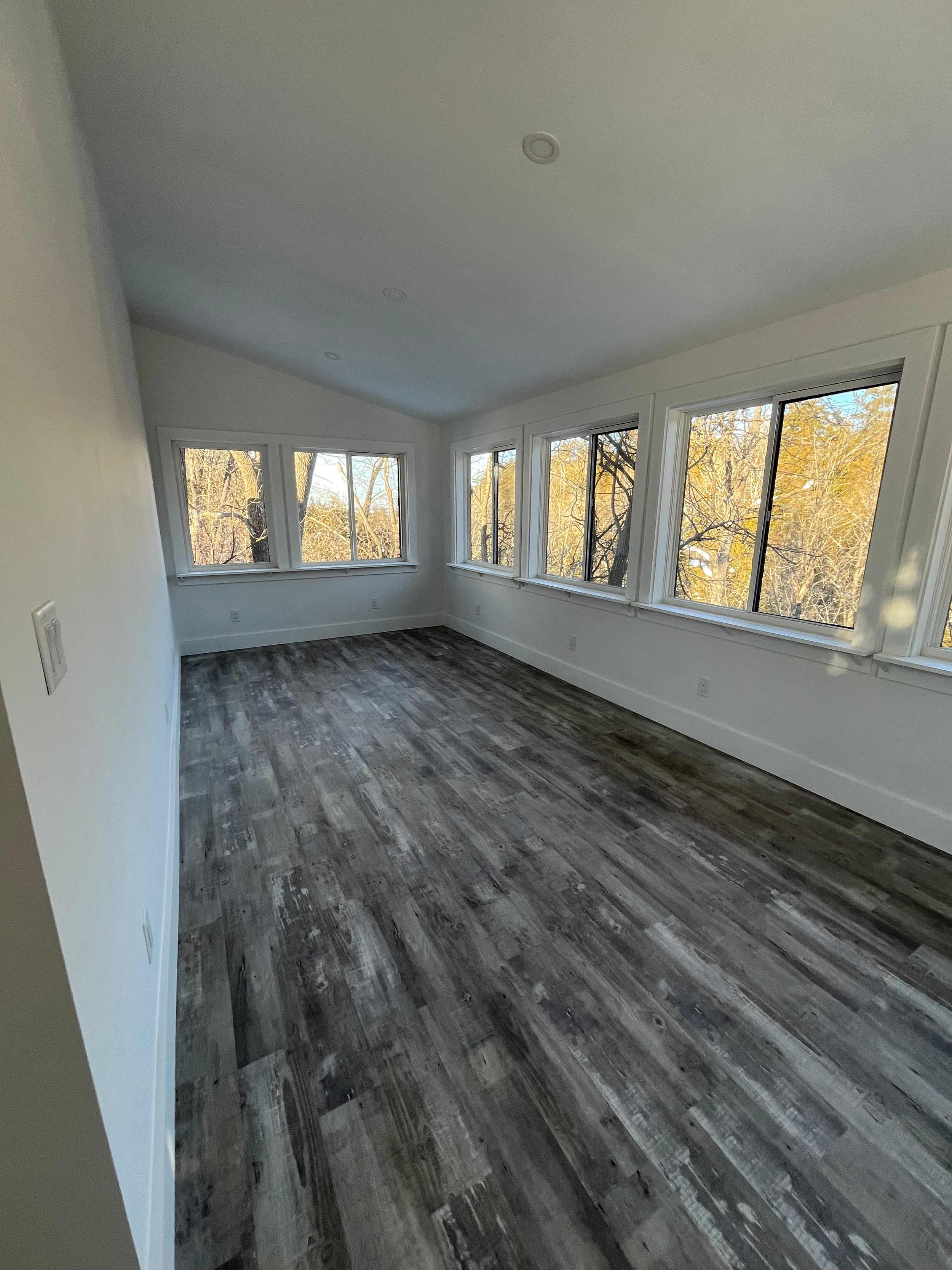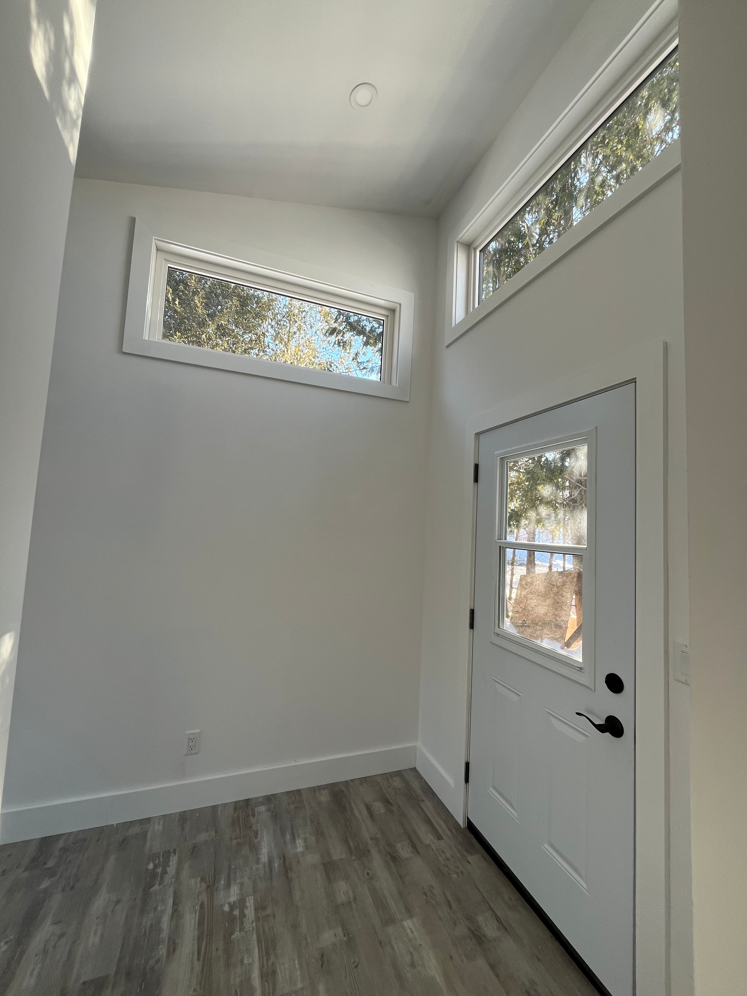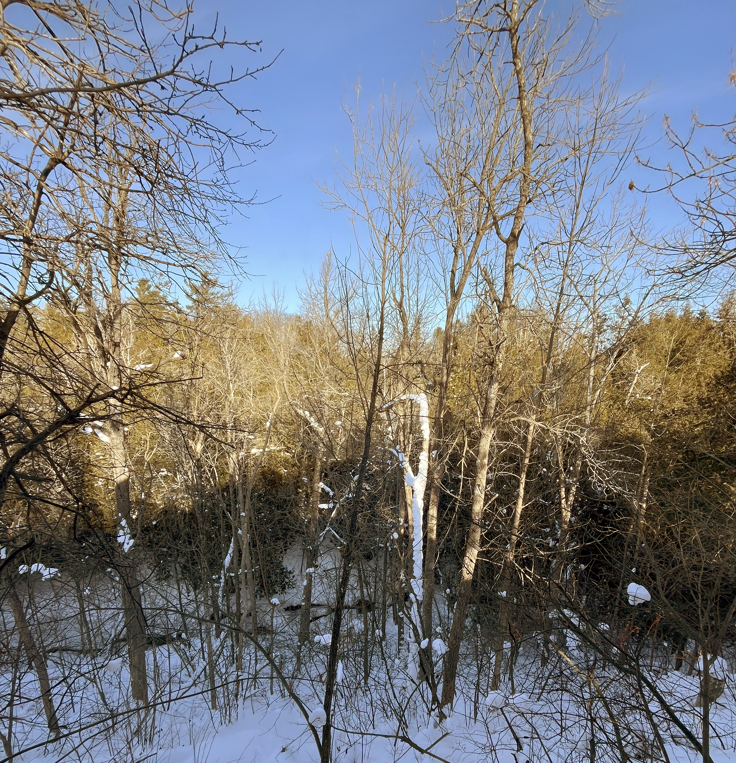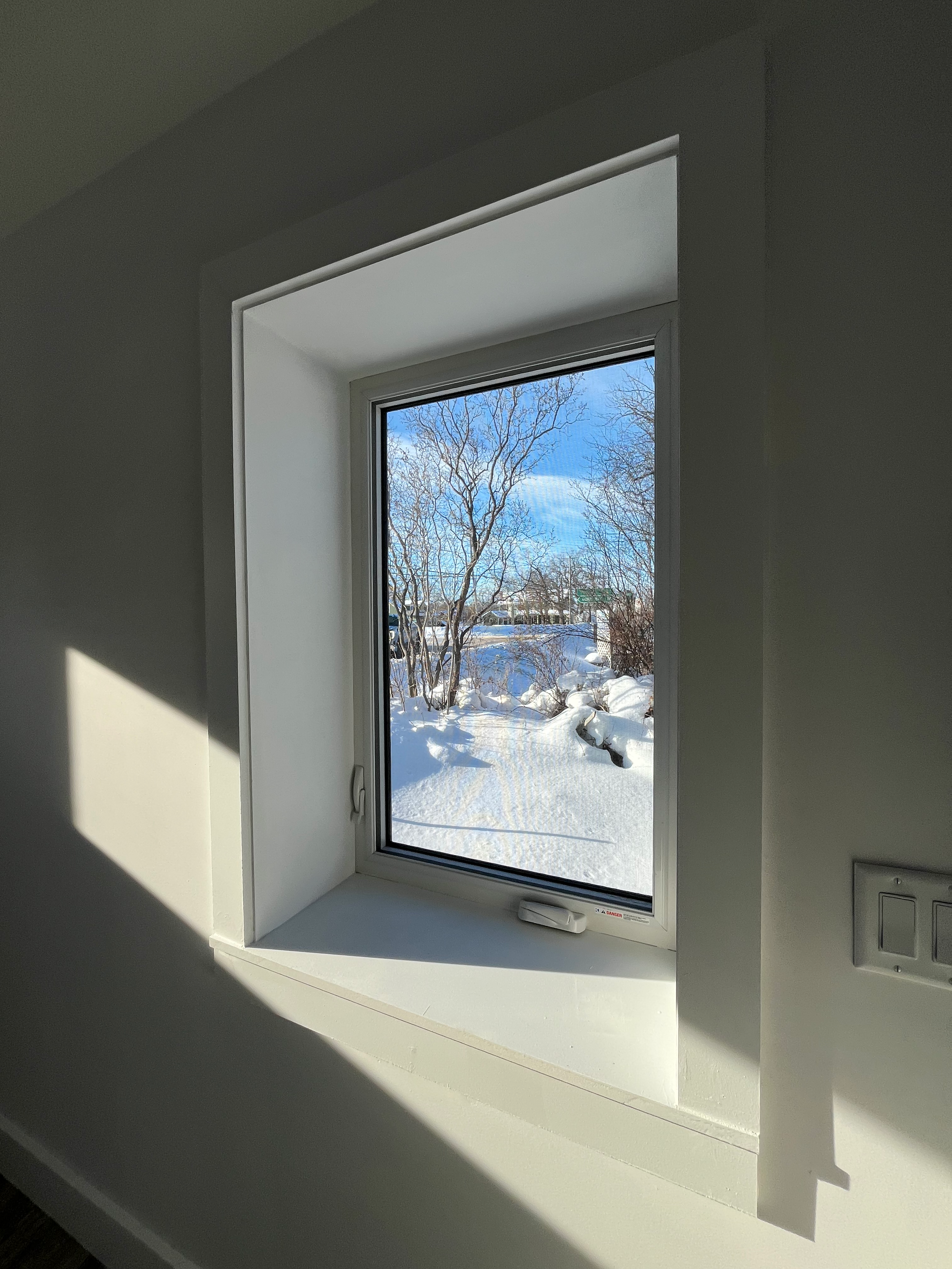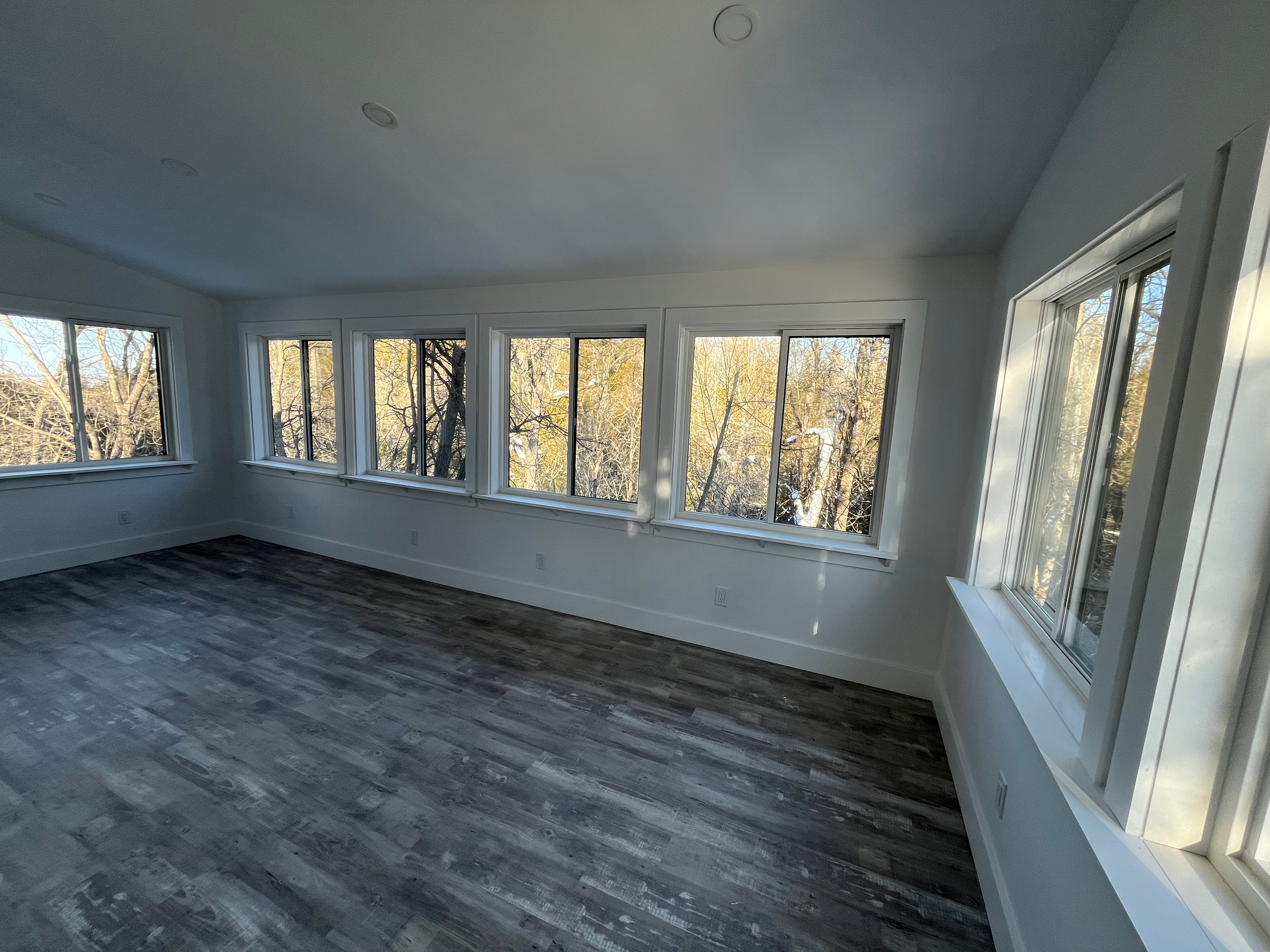 Inside you’ll find one bedroom plus additional loft space, and one bathroom with a shower. The heat pump system ready to be installed will keep the space warm in winter, and cool in the summer. There are high windows in the front living space, for privacy and soundproofing. The large back room features an entire wall of windows overlooking the Kagawong River Ravine, just down river from Bridal Veil Falls.